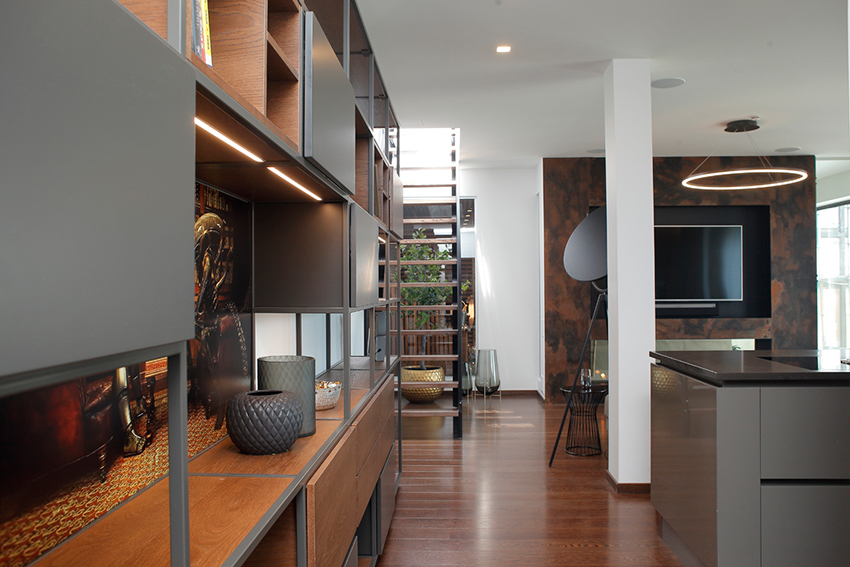 Eritellimusmööbel on sentimeetri kaupa läbi mõeldud ja kujutab endast ainuvõimalikku lahendust nii mõnelegi probleemile. Näiteks sai luua eraldi garderoobi sopistusse tänu sellele, et vaheseina esiku ja köögi vahel moodustabki juba kahepoolne mööbel, mis on ühest küljest garderoobi, teisest köögikapp. Vastavalt on sätitud ka kappide sügavused: esiku riidekapile vastandub köögi poolt õhuke kapp klaaside ja tasside jaoks. Tulemus on rahulik ja monoliitne, maksimaalselt funktsioneeriv.