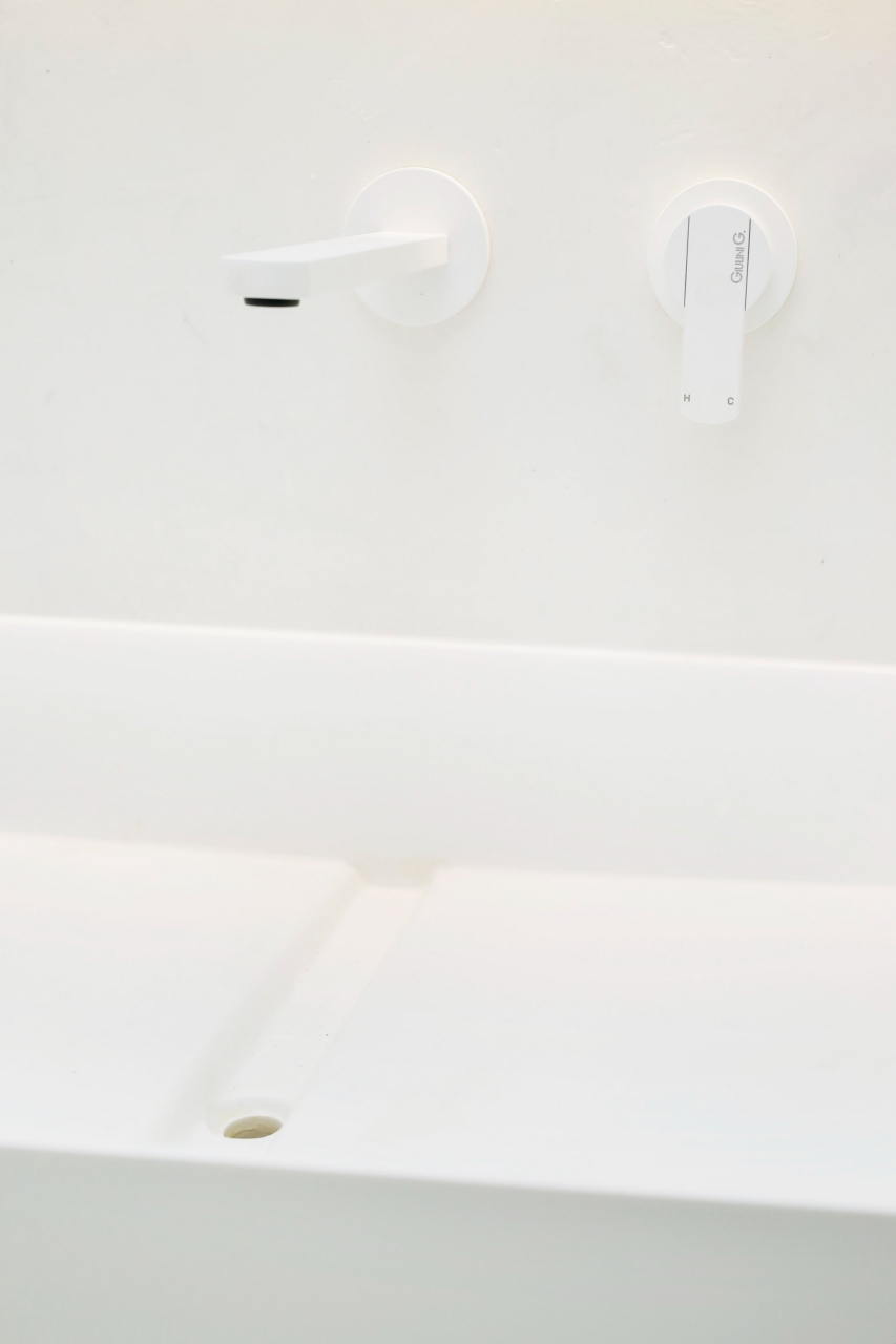 Mis on PAA valamute tohutu eelis, nad on juba oma vormid teinud juba tarbijasõbralikuks – ei ole nurki, mida me oleme näinud, kuidas nad armastavad koguda kõike ja teine asi muidugi on see materjal – imeline materjal, mida me praegu väga palju kasutame suurte tasapindade tegemiseks, mille sisse saab siis oma soovitud koguses valamuavasid ja mõõdud on hästi-hästi paindlikud. Mis selle materjali minu jaoks teeb eriti, sümpaatseks, on see, et see on üks väheseid materjale, maailmas, kus ma vannitoas luban, et jaa – seda materjali võib puhastada abrasiiviga. Hea näide… teeme siia ühe sodi…