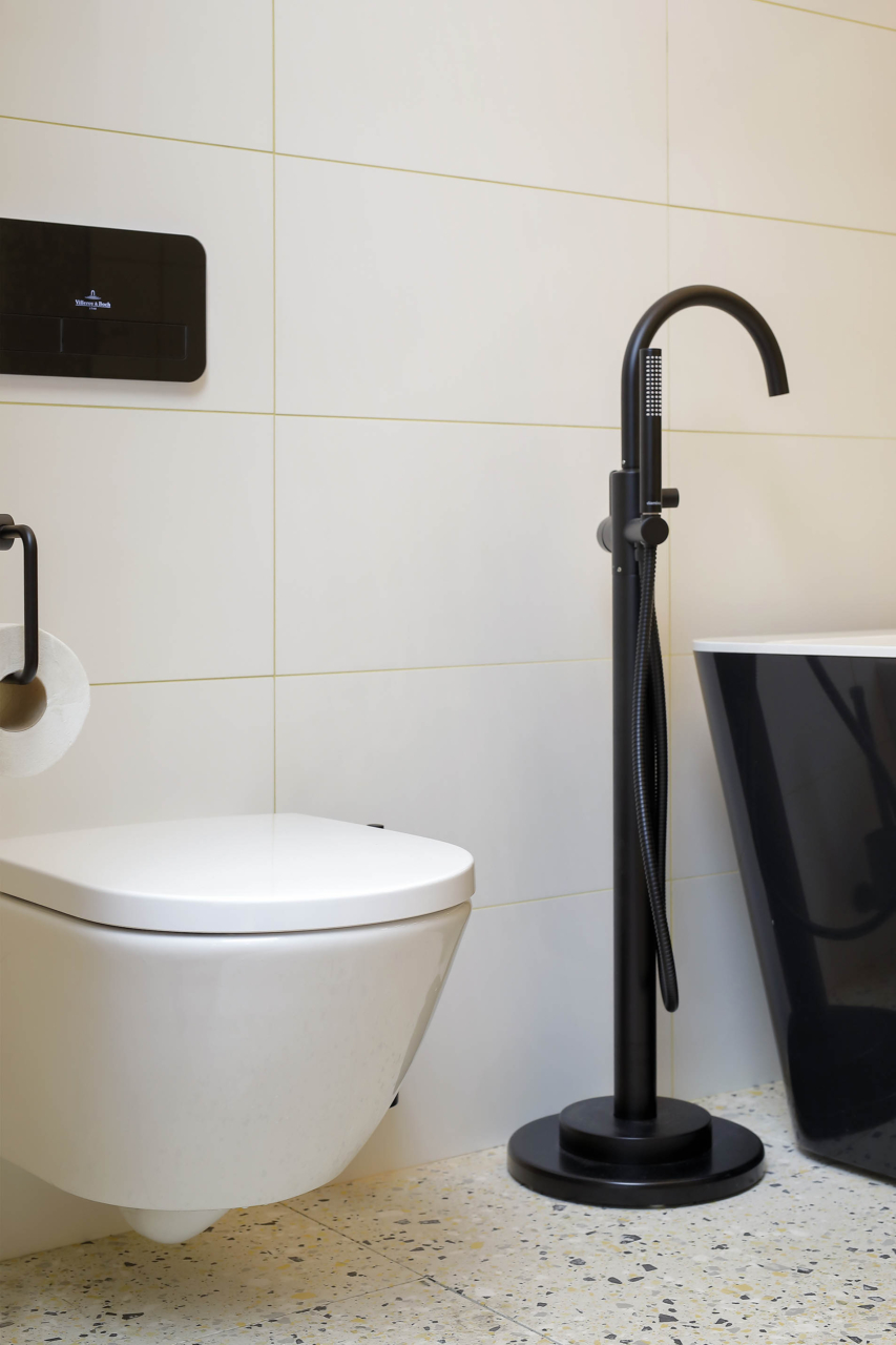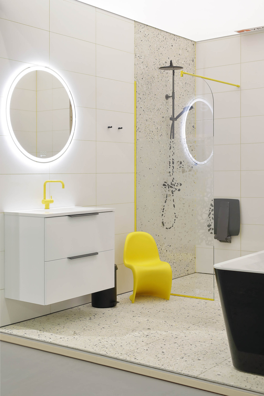 - Vannitoa kollane segisti ja köögi segisti: Arne Jacobsen, Hals Interiors