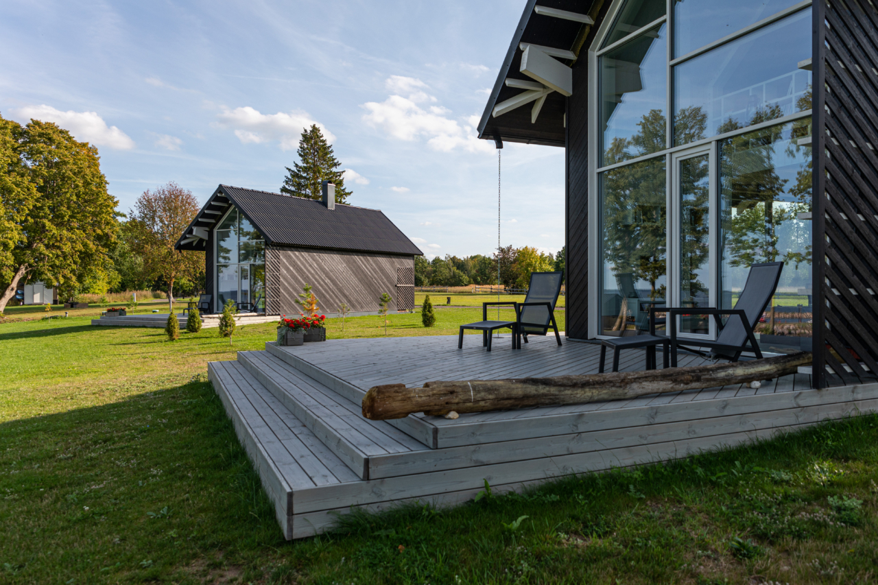 The sense of spaciousness comes from the light ceiling and wall colours, the contrast between light and dark surfaces, the large glass areas, and of course the carefully considered layout. The floor is finished in “Mustang” slate stone, supplied by a Saaremaa-based company, Kivi Projekt. The dark stone was chosen deliberately to enhance contrast, and it has proven itself over the years as a durable and reliable material.