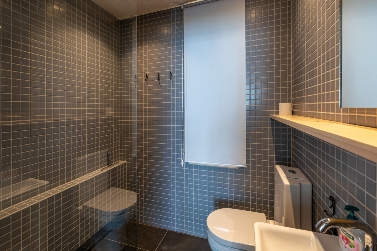 For the kitchen, laminated surfaces were used, as they do not rot or mould and should remain durable for many years. The approach is simple and functional. The bathroom, too, contains exactly what it can — not a single centimetre more than available — yet it accommodates a toilet, washbasin, and shower.