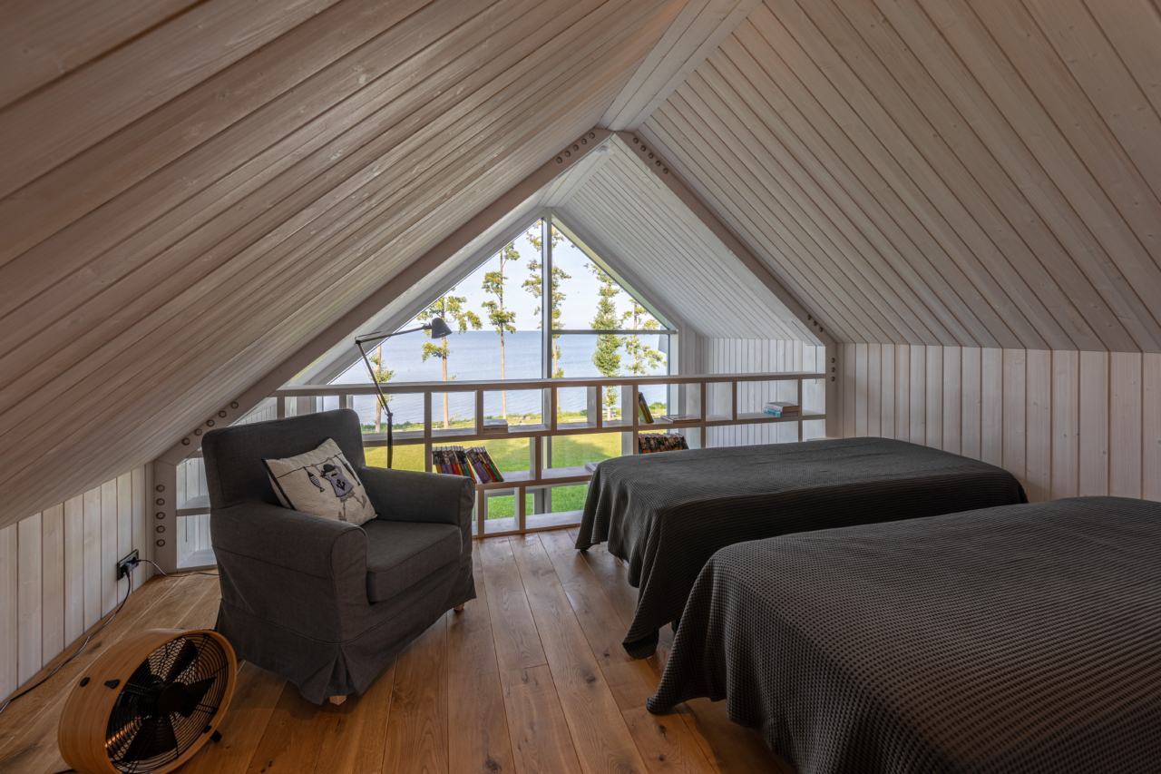 Teisele korrusele sai kaks tuba, kus on ööbimisvõimalus ja jooksis läbi mitmeid mõtteid, et kuidas tekitada piire selle õhuruumi äärde. Ja kui siis lõpuks hakkas siin vormi võtma, see ehitus, siis oli selge, et seda vaadet ei tahaks kuidagi moodi kinni panna ja ja siis sealt siis kuidagi moodi jäi pidama see idee, et see võiks võibolla raamaturiiuli funktsiooni ka täita