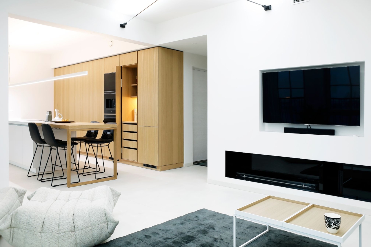 Üheks kompaktseks mahuks on liidetud garderoob, biokamin ja teler, mis moodustavad koos elutuba koridorist eraldava vaheseina.