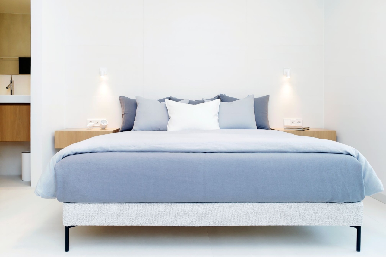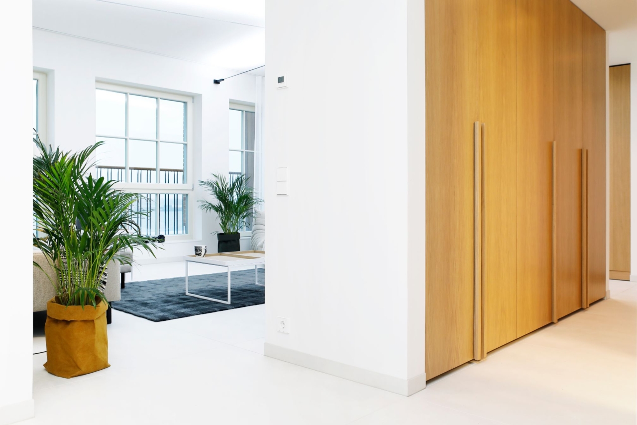 Kogu korterit läbib suuremõõduline keraamiline plaat Gigacer light (NOTO). Valge unikaalne Gigaceri plaat, millest oli valida ja kombineerida viis võluvat tekstuuri, katab ka magamistoa põrandat ja seinapindu – et ühendada ruume ning tuua neisse merelist puhtust ja avarust.