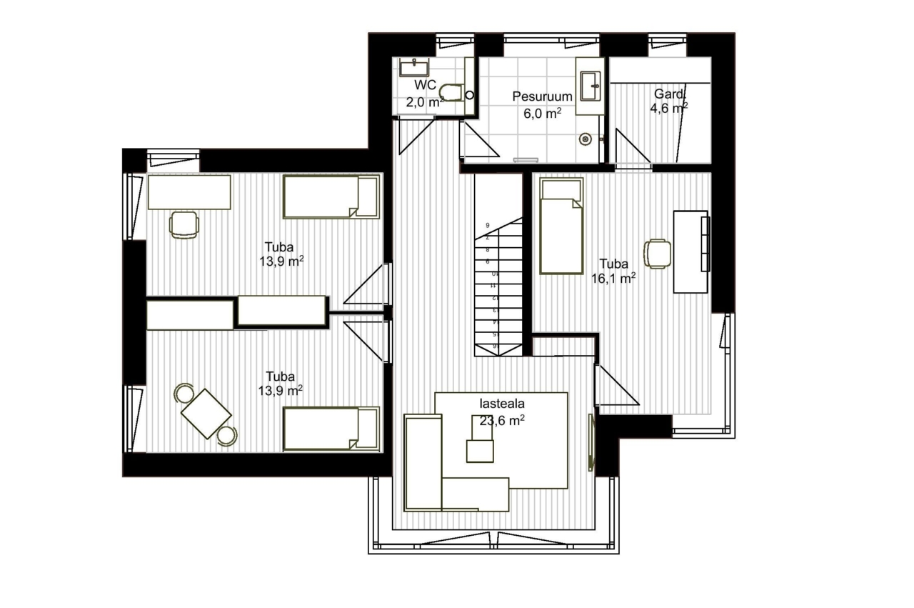 - Lastel on oma korrus, igaühel oma tuba, aga on ka ühine koosolemise ruum.