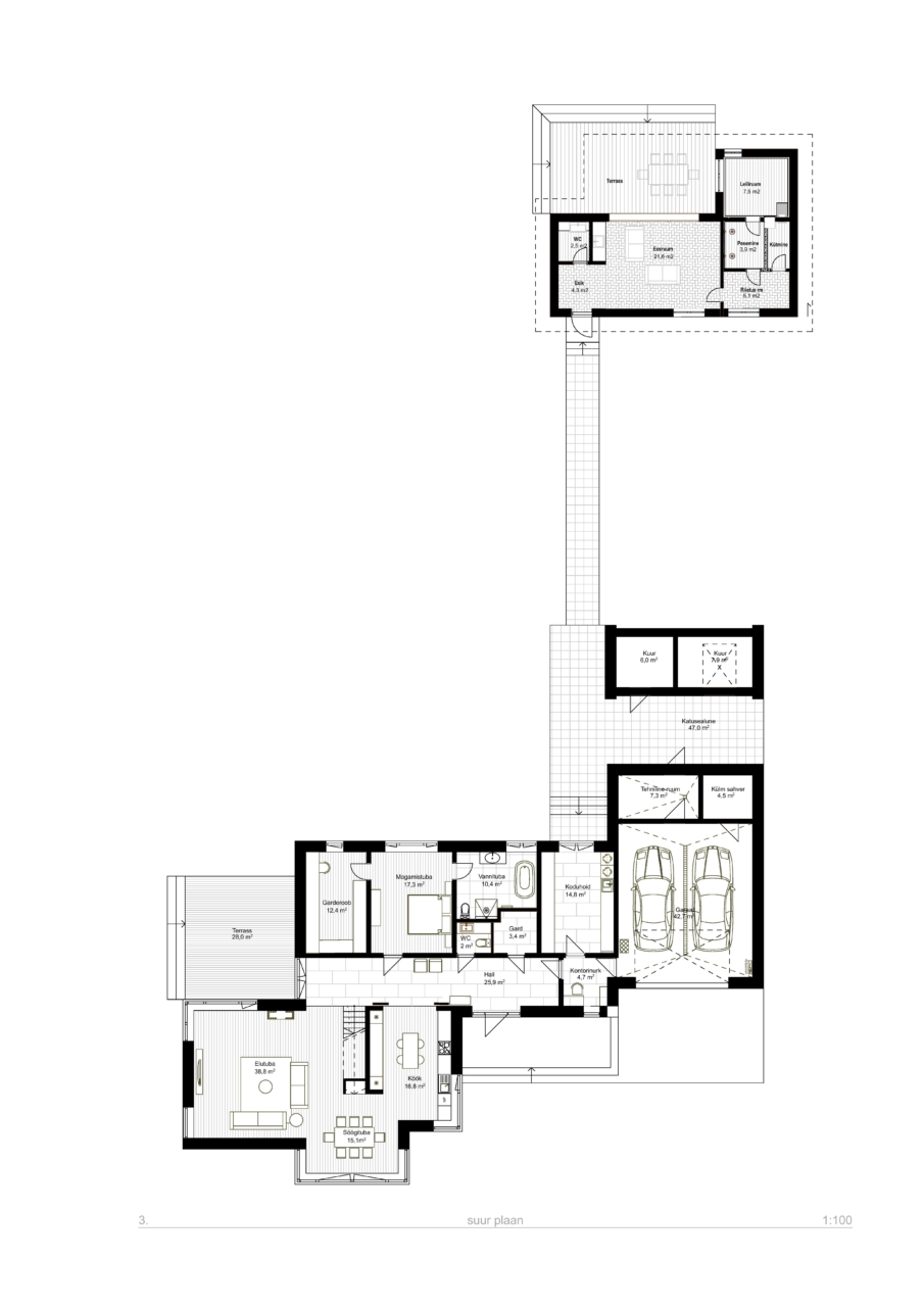 Tervikuna jaguneb kodu kaheks: suur maja, mis teenindab pere igapäevast elu ning maja juurde kuulub ka tore saunamaja.