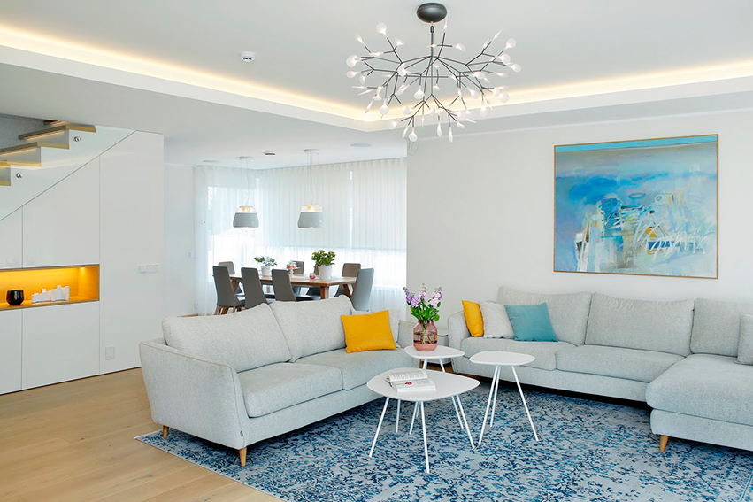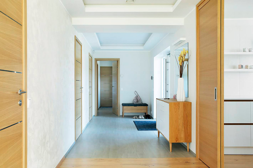 Tervikuna saame öelda, et värvitoonidelt on maja väga hele ja võib jääda mulje, et seda on raske korras hoida. Probleemi ennetamiseks on esikutesse teadlikult valitud tugev Valpainti dekorratiivkrohv, mis ongi väga hea valik lastega peredesse, kus vahepeal satuvad ikkagi väikesed mustad näpukesed mööda seina triipe vedama. Seda on hõlbus puhastada, ei jää järgi igasuguseid puhastamisjälgi. Samuti petab dekoratiivkrohv sillerdava pinnaga määrdunud või puhastatud koha ära. Teine hea materjal on vedeltapeet, mida on kerge modelleerida ja on kohtparandatav. Samas reflekteerib hästi valgust ja on akustiliste omadustega.