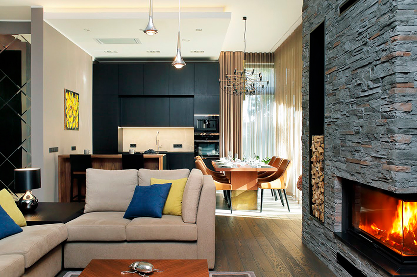 Kamin oma kaunite tule-ekraanidega on vaadeldav kahest küljest ning siin on ka puudehoidmise koht. Kamin on viimistletud sama dekoratiivkiviga, mida on kasutatud ka maja fassaadil.